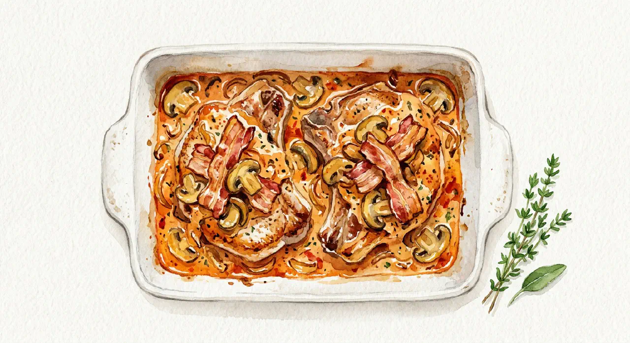 Paprika pork chops are a simple oven dish with pork chops, crispy bacon, and mushrooms in a paprika-tomato cream sauce. The chops are briefly browned, transferred to a baking dish, and finished in the oven with sauce and mushrooms on top. Serve with baguette and salad.