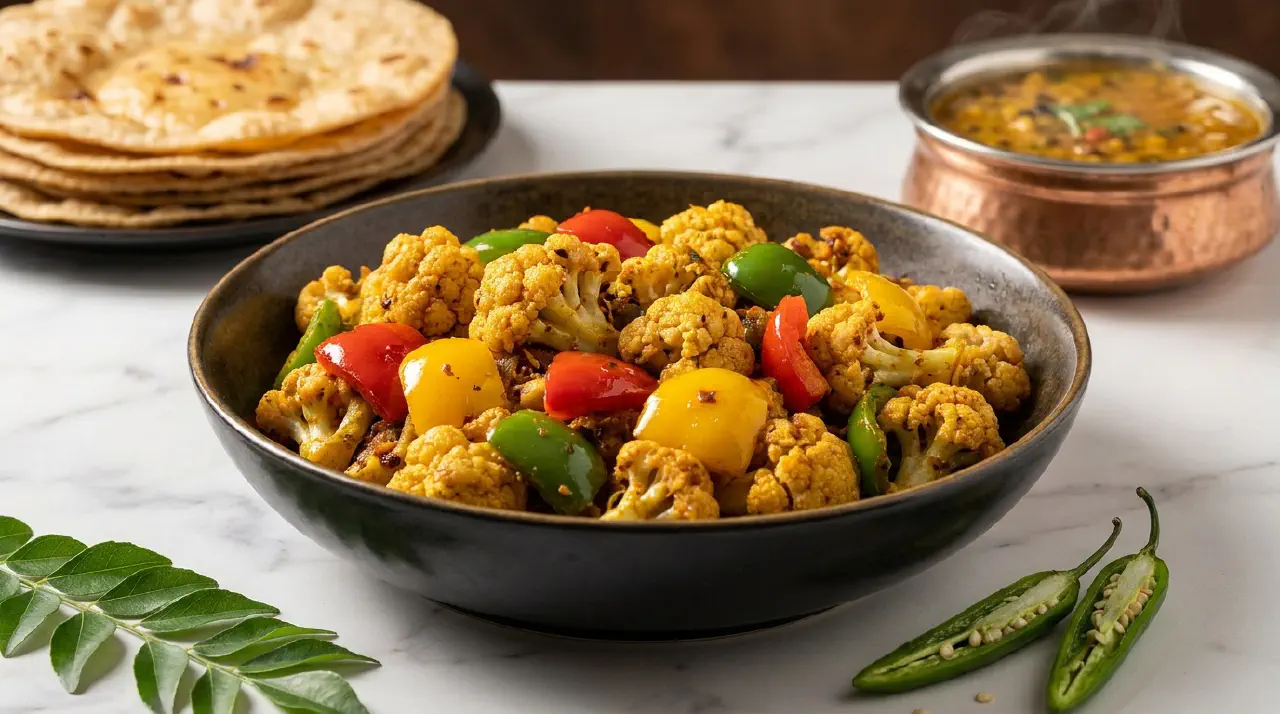 The light seasoning is the point. Turmeric gives the colour and a mild, earthy base, and the heat comes from fresh green chilli rather than dried spices. The cauliflower is allowed to keep its own flavour, and the peppers add sweetness and crunch towards the end of the cooking time.
