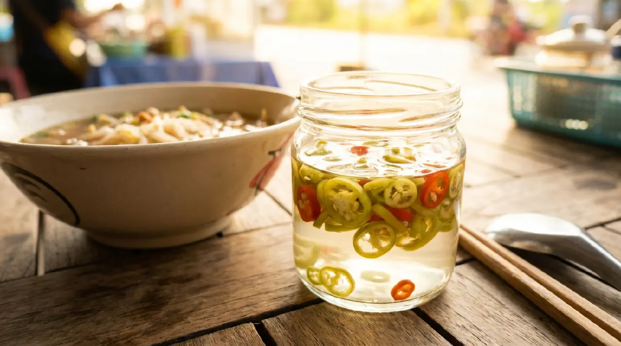 One of the four standard condiments found at Thai noodle stalls, alongside sugar, fish sauce, and chili flakes. It’s just chilies and vinegar - the acidity cuts through rich, salty dishes like pad see ew and noodle soups. Takes about 3 minutes to prepare, then needs at least 20 minutes to sit before using.