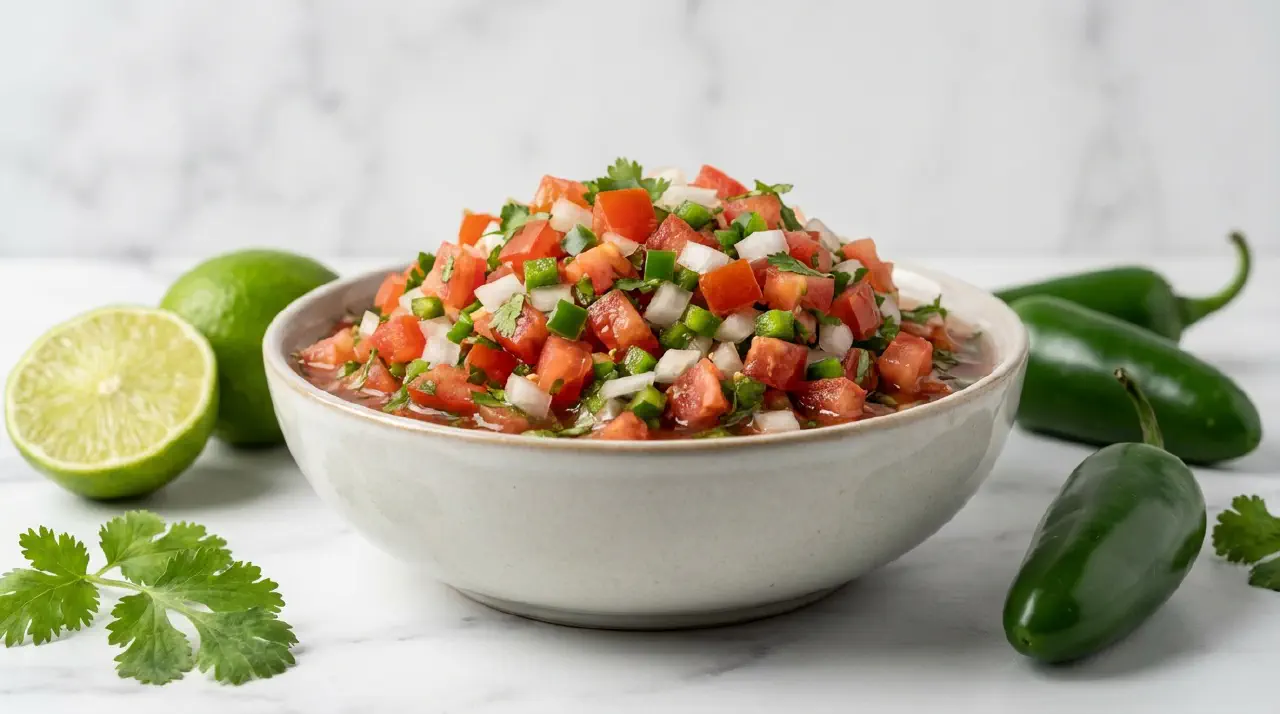 Pico de gallo is a raw Mexican salsa of chopped tomatoes, onion, chile, cilantro, and lime. Nothing is cooked, nothing is blended. The quality depends on the ripeness of the tomatoes and the balance of the seasoning.