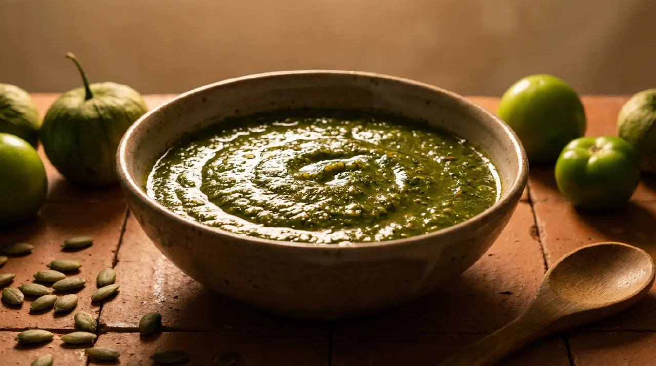 Pipian verde is a Mexican pumpkin seed sauce from Puebla and surrounding regions. It is built on tomatillos and fresh herbs. The technique: toast the seeds, blend everything, fry the puree, then simmer with broth.