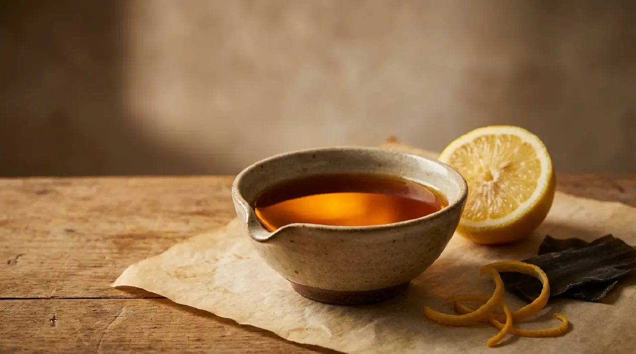 Ponzu is a Japanese citrus-soy sauce. Soy sauce, fresh citrus juice, rice vinegar, and mirin are combined with kombu and bonito flakes and left to steep in the fridge for at least overnight. The result is bright, savory, and balanced – used as a dipping sauce for shabu-shabu, hot pot, gyoza, sashimi, and grilled fish.