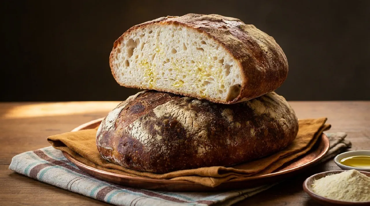 A rustic Italian bread from the Apulia region with high hydration (around 80 percent), producing an open crumb with dramatic holes and a nutty flavor. Made with durum flour and developed using a stretch-and-fold method.