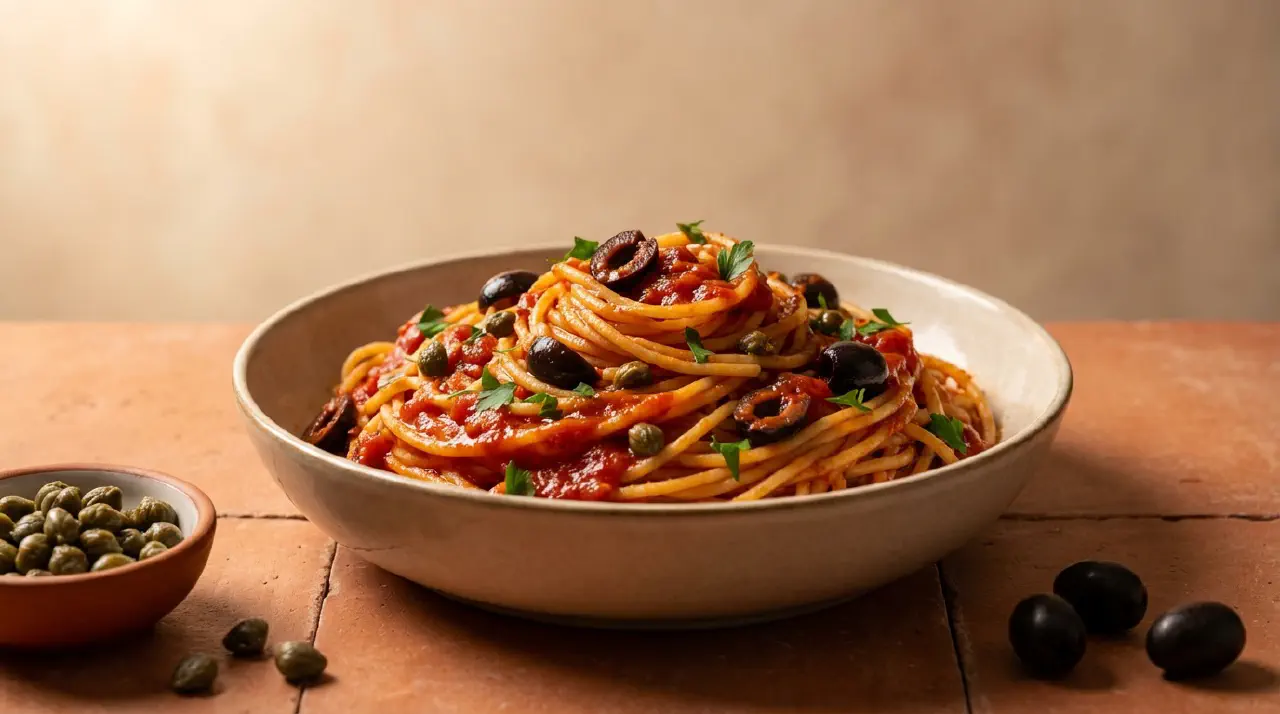 Puttanesca is a Neapolitan pasta sauce built on anchovies, olives, capers, and tomato. The anchovies dissolve into the oil to provide a savory backbone – the finished dish does not taste fishy. Traditionally served with spaghetti, no cheese.