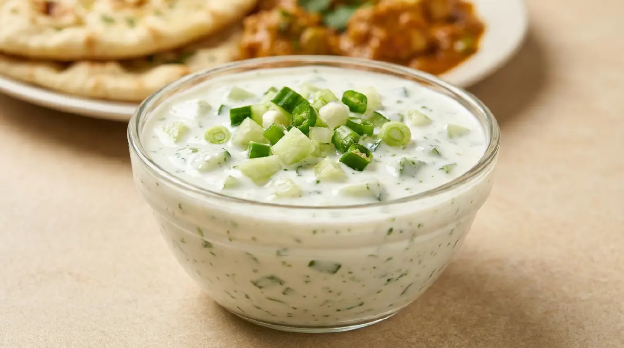 The basic recipe uses cucumber, but raitha is also made with banana, tomato, mint or boiled potatoes. The tangy yoghurt is the foundation — a creamy base that binds the finely chopped vegetables together. A single green chilli adds a little bite without competing with the main dish.