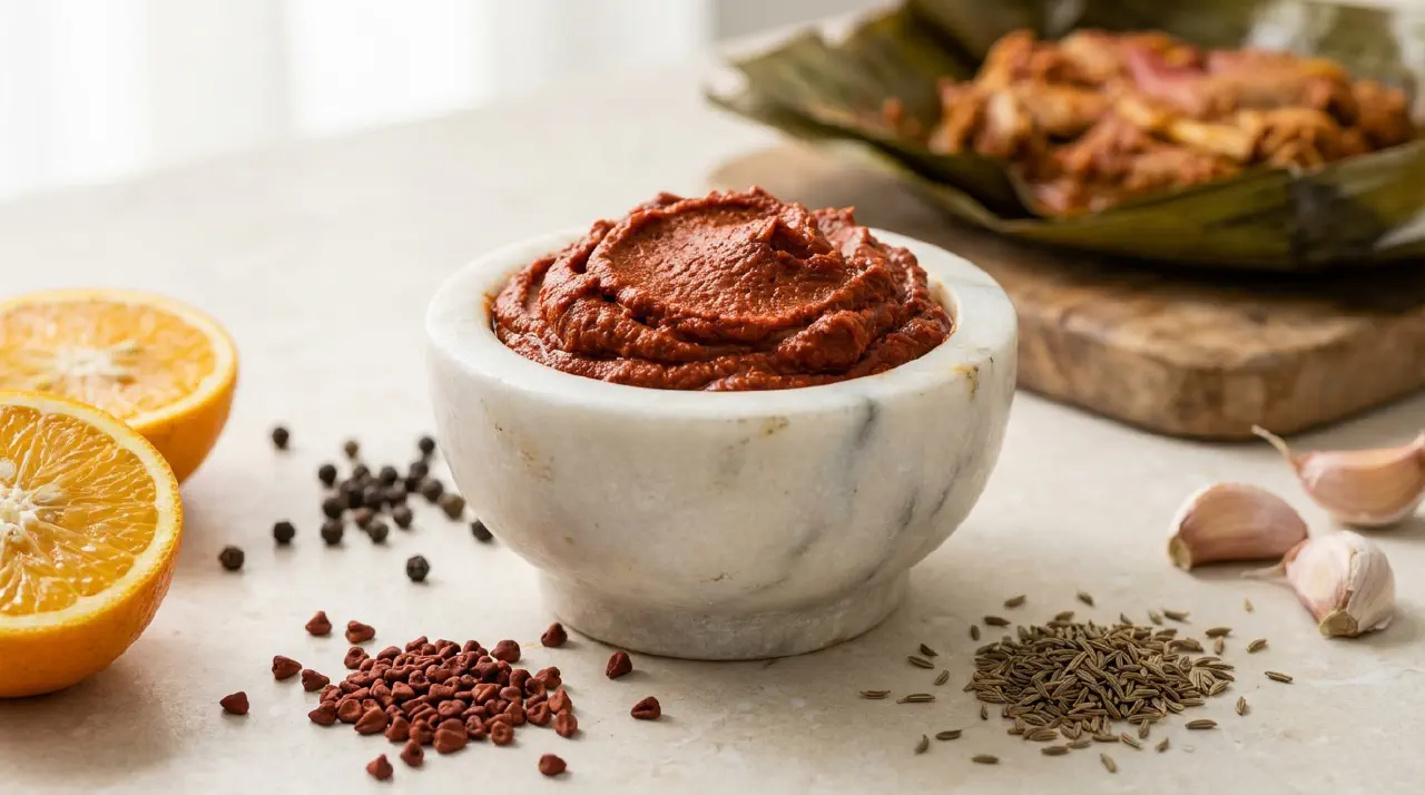 Recado rojo is a brick-red Yucatecan spice paste built on annatto seeds, garlic, and sour orange juice. It is the base for cochinita pibil, pollo pibil, and many other Yucatecan dishes. A small amount goes a long way, and the paste keeps for months refrigerated.