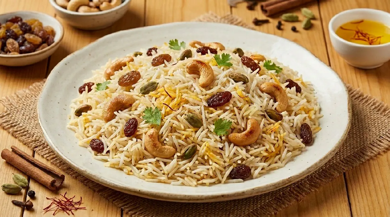 Kashmiri pulao is a fragrant basmati pilaf with whole spices, saffron and a touch of orange blossom water. It is finished with toasted cashew nuts, pistachios and small raisins, so each spoonful alternates between soft rice, something crunchy and something sweet.