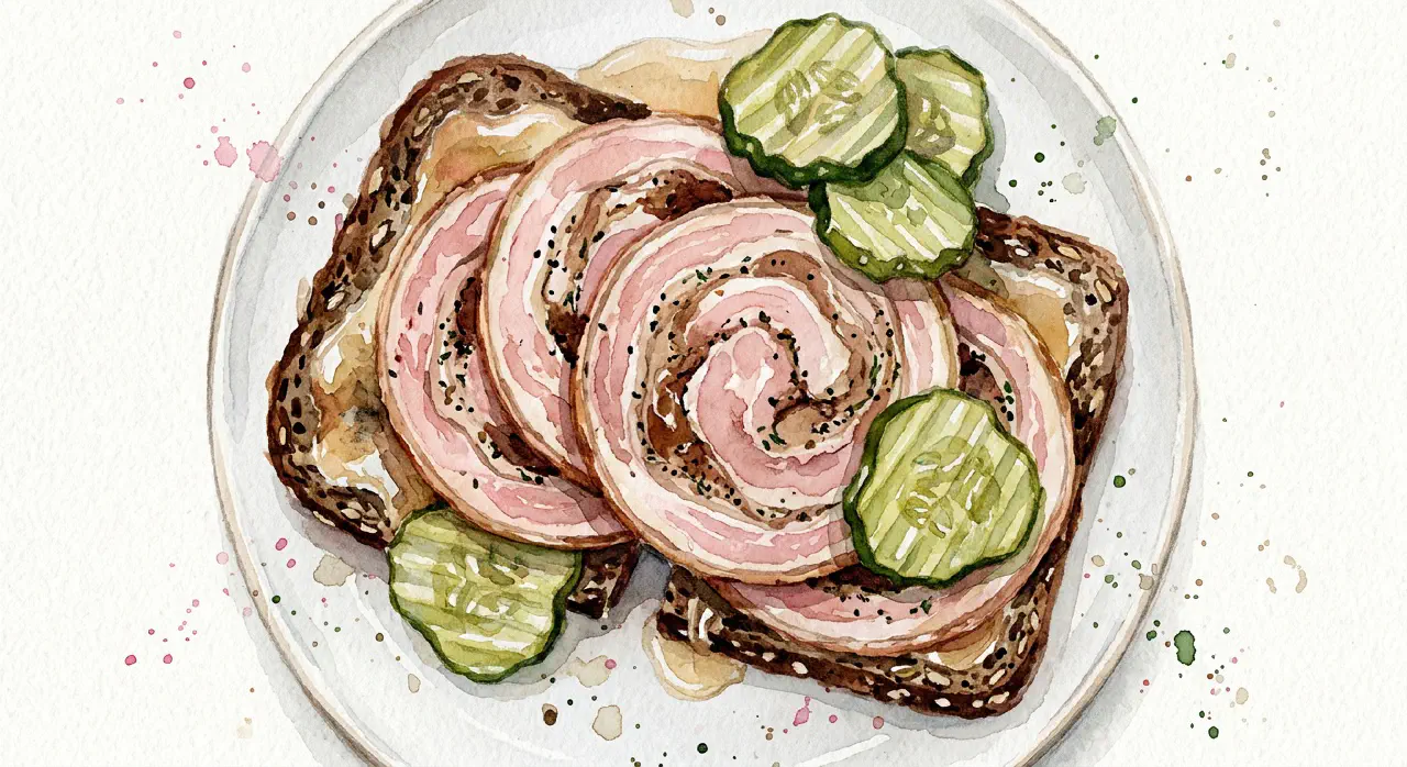 Rullepølse is a classic Danish charcuterie — a pork belly brined in salt water, seasoned with allspice, nutmeg, and marjoram, rolled up, boiled, and pressed. It is served in thin slices on rye bread, typically with meat jelly and pickles. An essential part of Danish lunch culture.