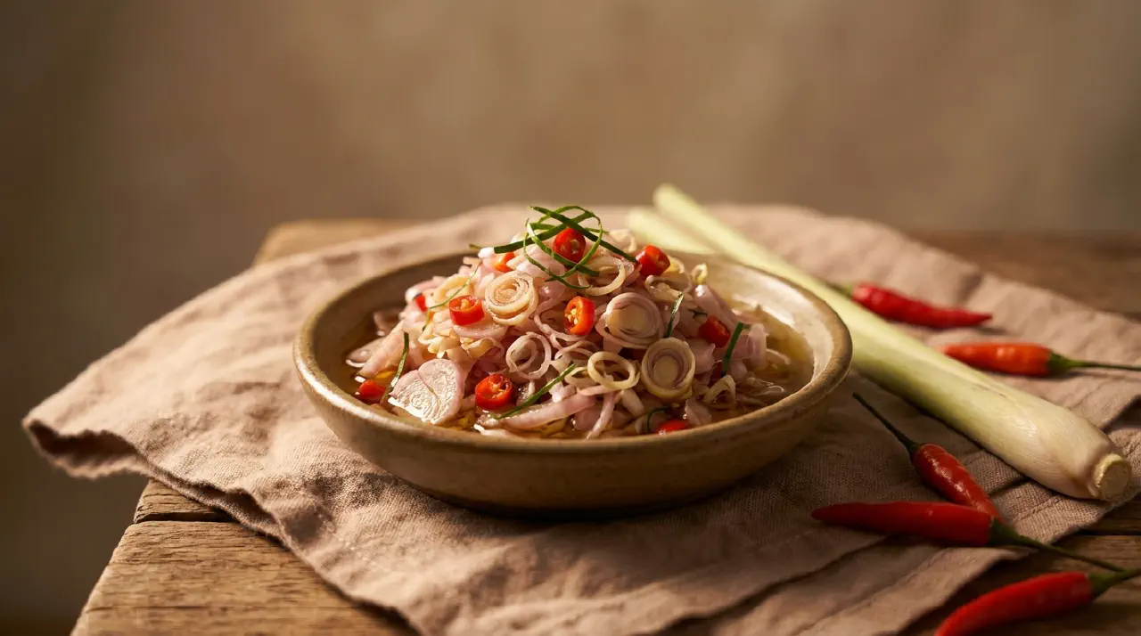 Sambal matah is a Balinese raw shallot and lemongrass relish. Thinly sliced aromatics – shallot, lemongrass, chili, kaffir lime leaf, and garlic – are combined in a bowl and hit with hot coconut oil, which sizzles and lightly wilts everything without fully cooking it. The result is sharp, aromatic, and bright.