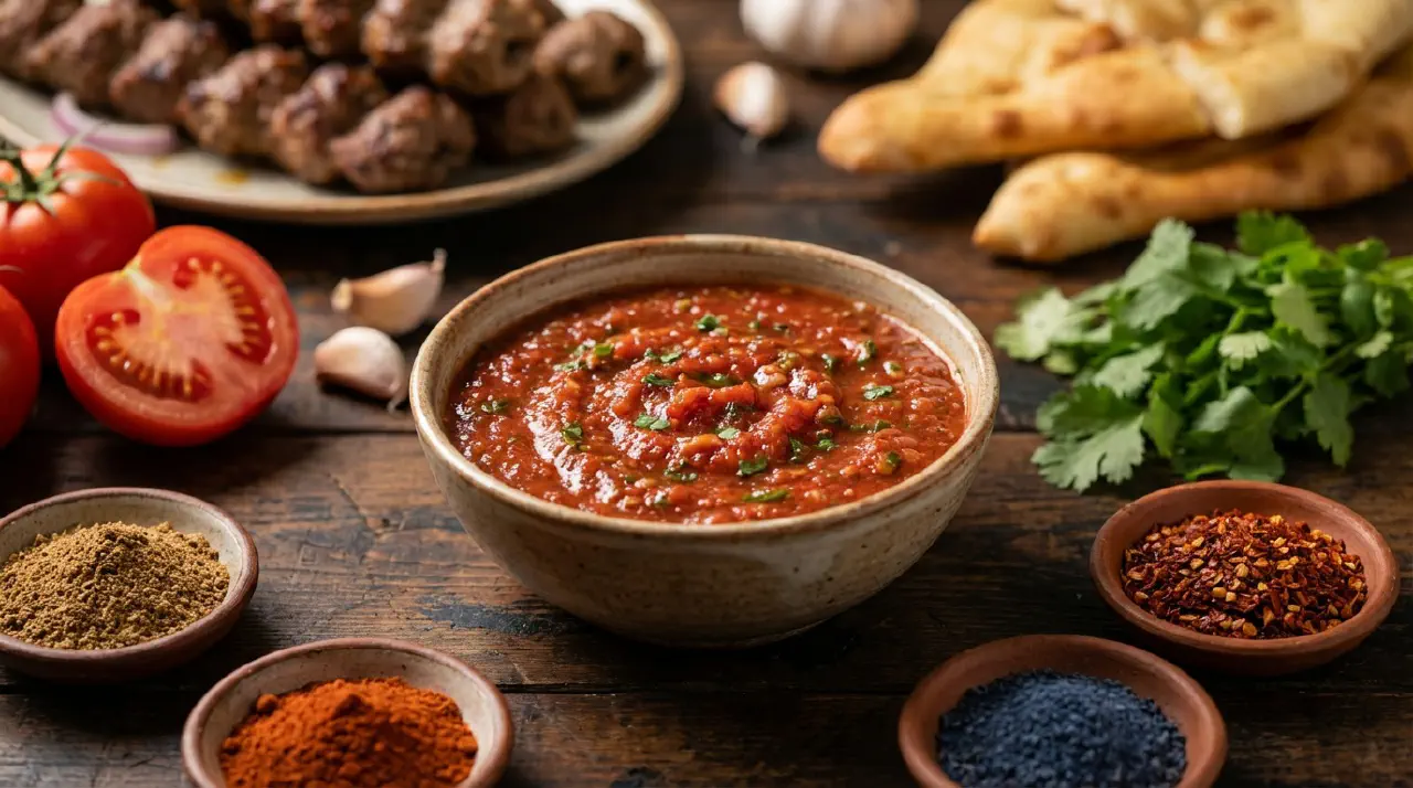 Satsebeli is a Georgian tomato sauce seasoned with garlic, coriander, fenugreek, and fresh cilantro. The word simply means “sauce” in Georgian, and this tomato version is the most common modern interpretation. It is served as a table condiment alongside grilled meat, potatoes, eggs, bread, and dumplings – essentially the Georgian equivalent of ketchup, but with far more personality.