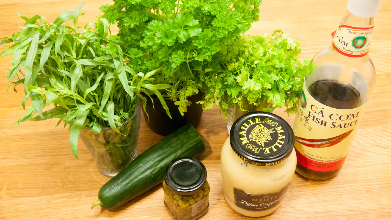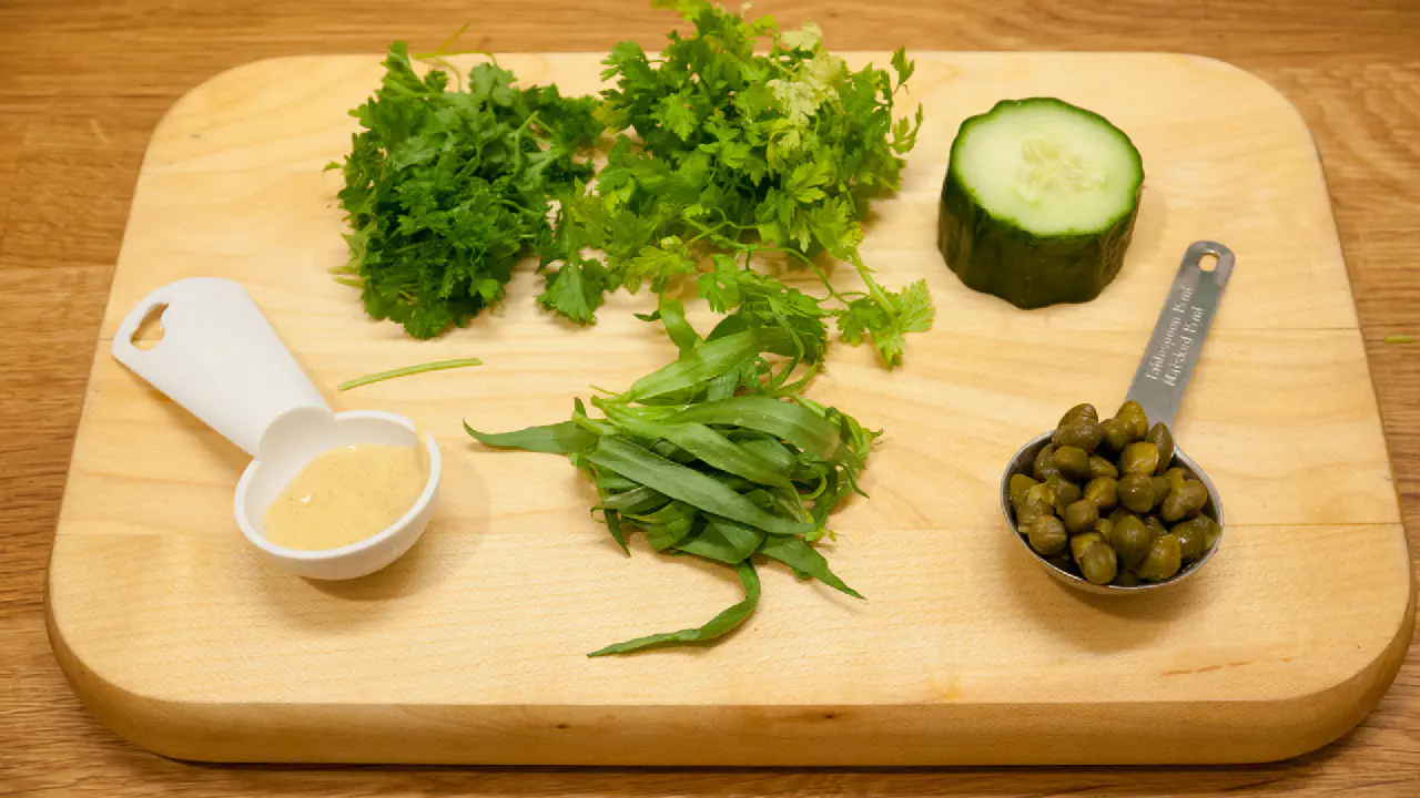 Chop the cucumbers, capers, parsley, chervil and tarragon finely.