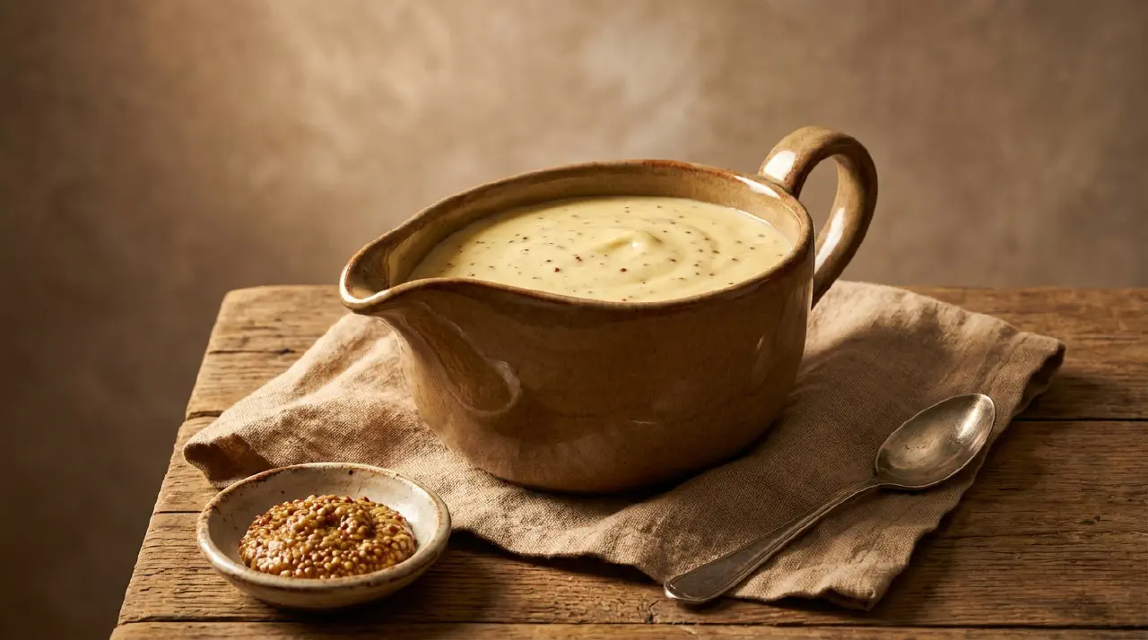Senfsosse is a German mustard sauce – a simple bechamel-style sauce flavored with mustard, traditionally served over hard-boiled eggs with boiled potatoes. It is a weeknight staple across Germany, quick to make and quietly satisfying.