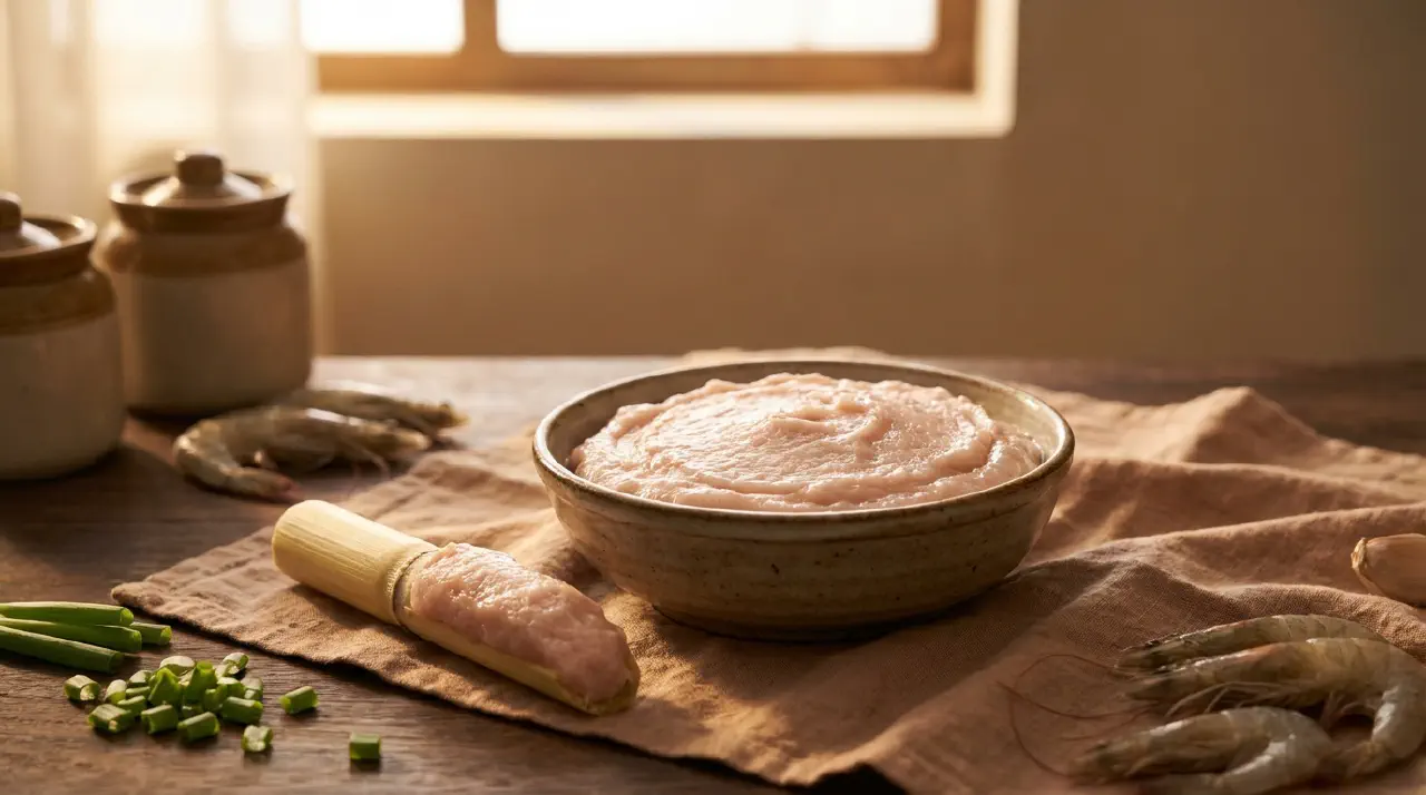 A Vietnamese shrimp paste used as a filling or topping in various dishes - stuffed into tofu, spread on sugarcane, or wrapped in rice paper before frying. It’s smooth and bouncy once cooked, with a clean shrimp flavour seasoned simply with fish sauce, pepper, and a bit of spring onion and shallot.
