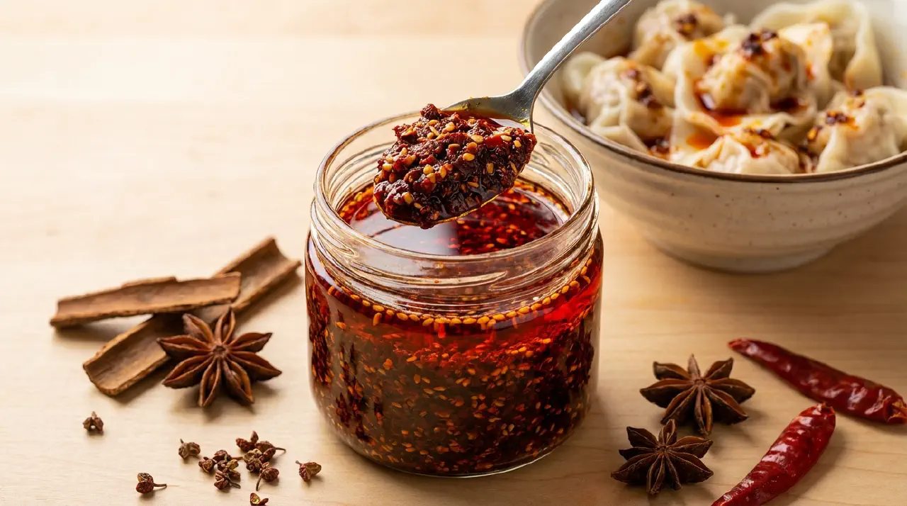 Sichuan chili oil is a foundational condiment in Sichuan cooking. This is the aromatic version (xiangla hongyou), with star anise, cassia, and ginger infused into the oil before combining with ground chilies using a three-temperature pour. Each temperature stage extracts different chili compounds: high heat for fragrance, mid for color, low for spice.