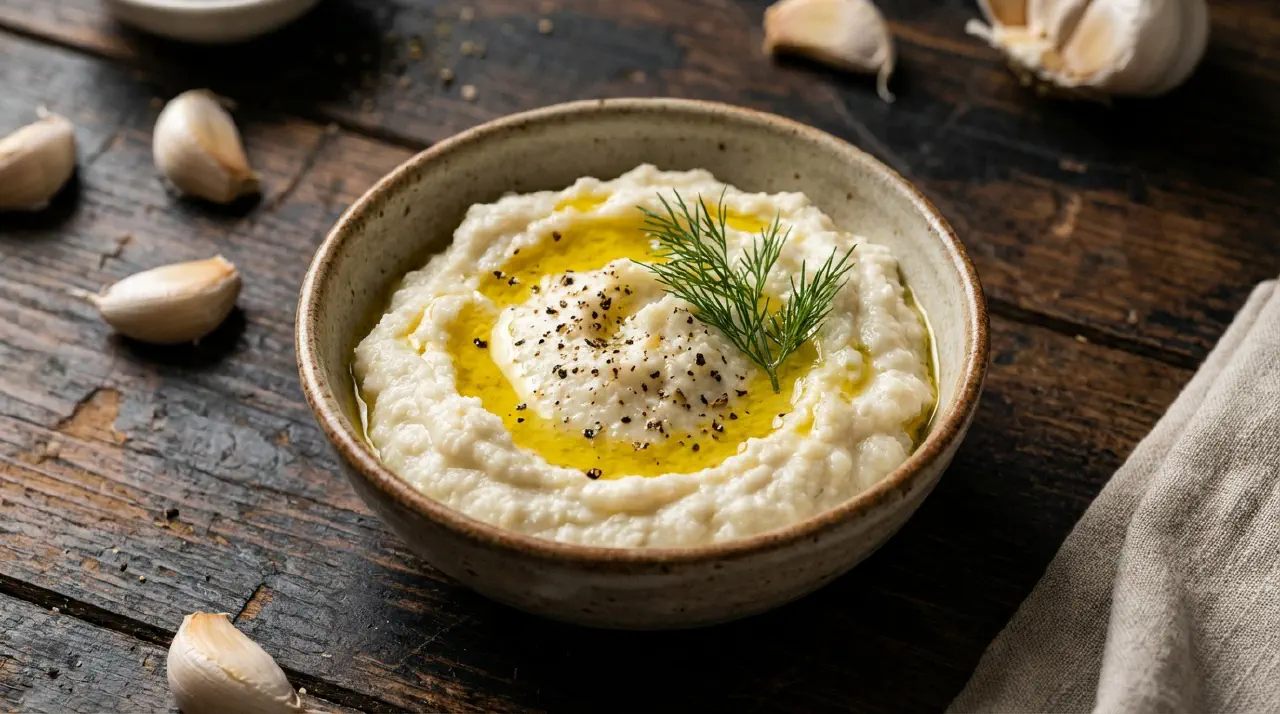 Skordalia is a Greek garlic and potato dip, thickened with olive oil in the style of making mayonnaise. It is pungent, creamy, and served at room temperature alongside fried cod, fried vegetables, or bread. The key is mashing the potatoes by hand – never use a food processor, which makes them gluey.