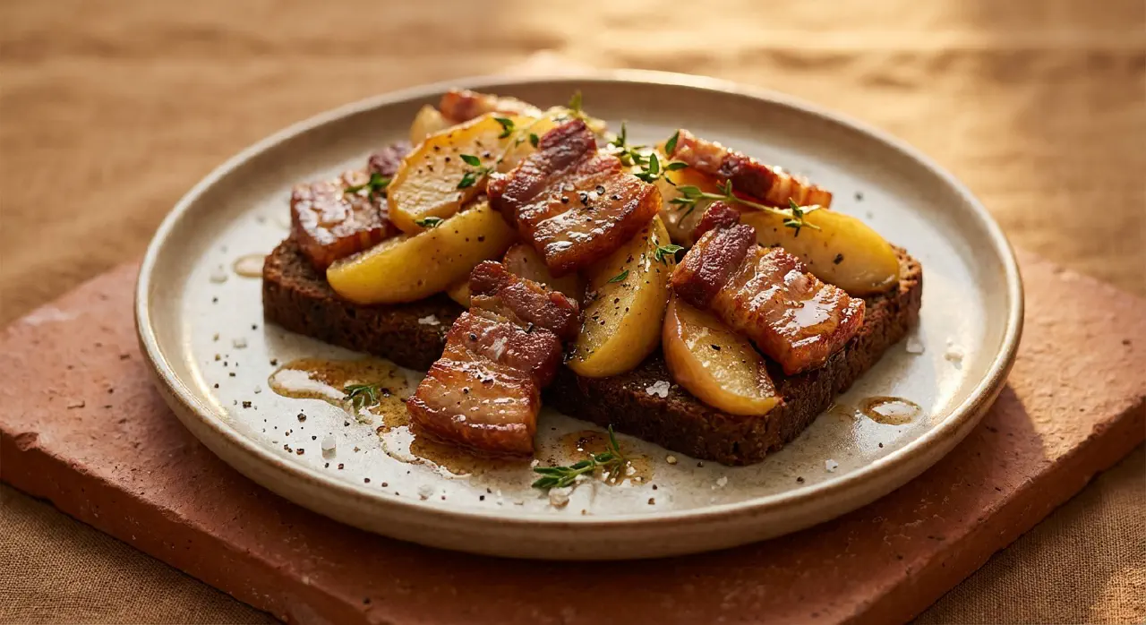 Æbleflæsk is an old Danish dish that traditionally belongs to Christmas and Easter, but it deserves a place on the table year-round. The dish is built on a simple idea: crispy pork combined with apples caramelised in pan fat and sugar, so they become soft and sweet. The contrast between the salty, crispy pork and the warm, caramelised apples gives a sweet-salty balance that is hard to beat. The brown butter adds a nutty depth, and the thyme lifts it all with a fresh, herby note.