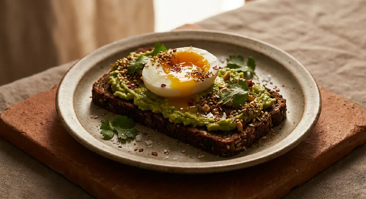 Avocado with soft-boiled egg and dukkah is a smørrebrød that brings together Danish, Middle Eastern and Australian food traditions on a single slice of rye bread. Dukkah is an Egyptian spice blend of nuts, sesame seeds and roasted spices that gives crunch and warmth to the soft avocado and runny egg yolk. The soft-boiled egg — cooked for exactly 6 minutes — should have a liquid, orange centre that acts as a natural sauce when broken open. This is a modern smørrebrød with many textures: the creamy, the crunchy and the runny in every bite.