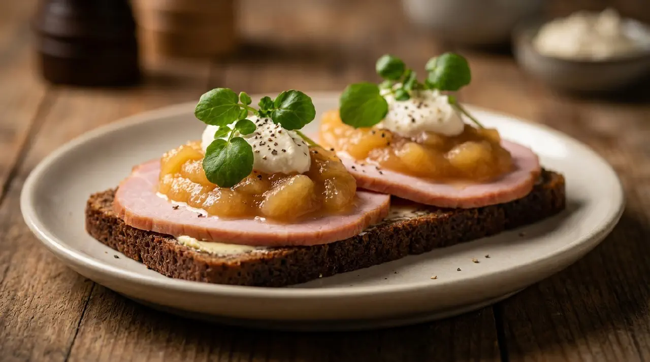 Smørrebrød with Hamburgerryg, Apple Compote and Horseradish Cream