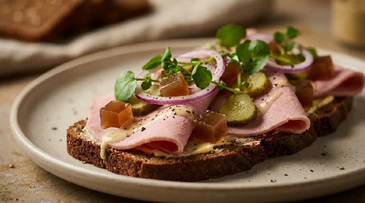 Smørrebrød with Salt Beef, Meat Jelly and Mustard Vinaigrette