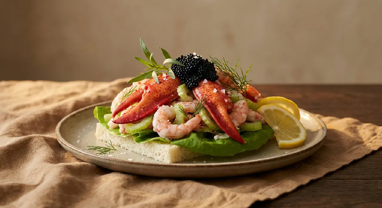 Seafood salad with lobster and prawns is the luxury version of the classic prawn open sandwich. The lobster claws give a firm, meaty texture and a rich, sweet flavour that complements the smaller, more delicate prawns. The tarragon-citrus dressing is what ties it together — tarragon’s lightly anise-like note pairs with seafood as few other herbs do, and the citrus acidity keeps the dish fresh. Celery adds crunch and a green bitterness that stops the salad from being one-dimensional. This is a smørrebrød for special occasions — confirmations, milestone birthdays and Christmas lunches — and it requires investing in good-quality seafood.