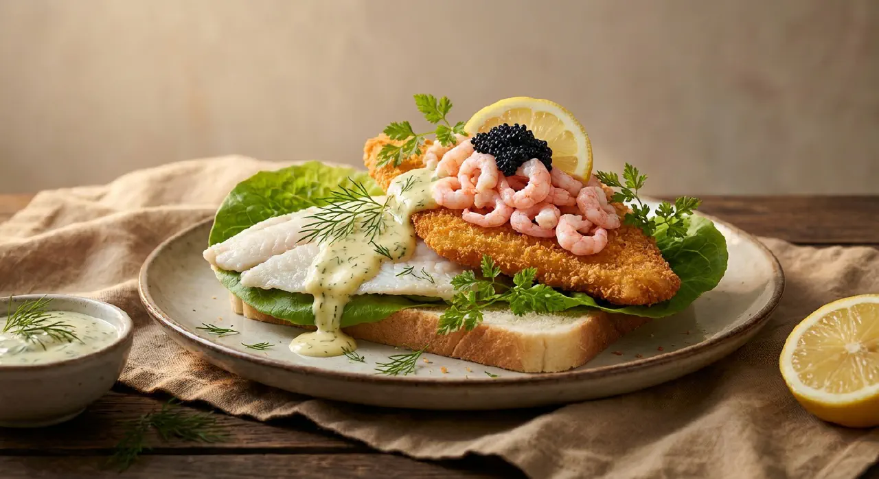 Smørrebrød with Stjerneskud, Steamed and Breaded Plaice