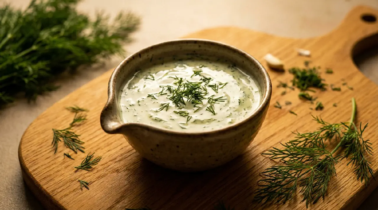 Sos koperkowy is Polish dill sauce – a roux-thickened broth and cream sauce finished with fresh dill. It is quick to make and traditionally served with fish, meatballs (pulpety), or boiled potatoes.