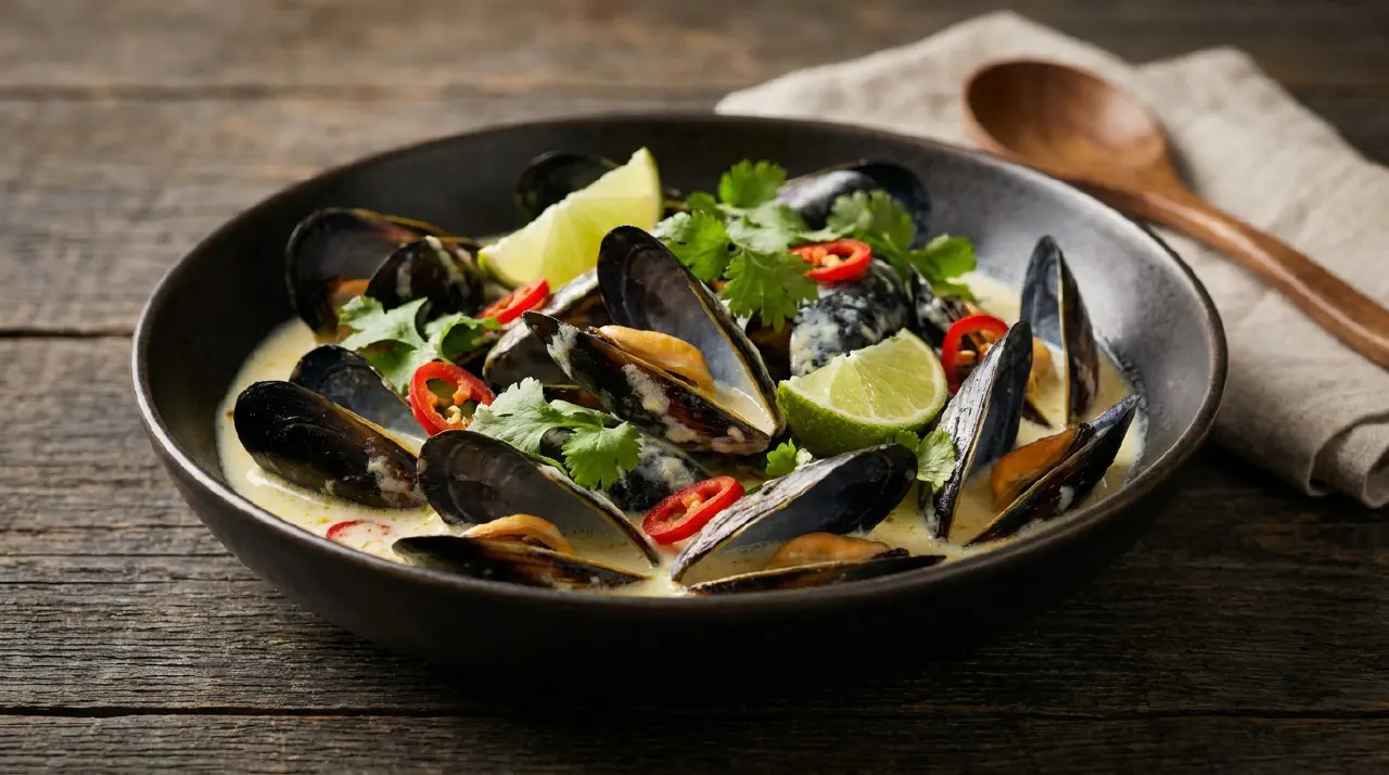 Tisrya masala are mussels steamed in wine vinegar and tossed in a sauce of yoghurt, coconut, turmeric, and garam masala. The dish is inspired by the Indian west coast kitchen, where fresh shellfish and spiced yoghurt are a familiar combination — particularly in Goa and Kerala, where mussels are everyday food.