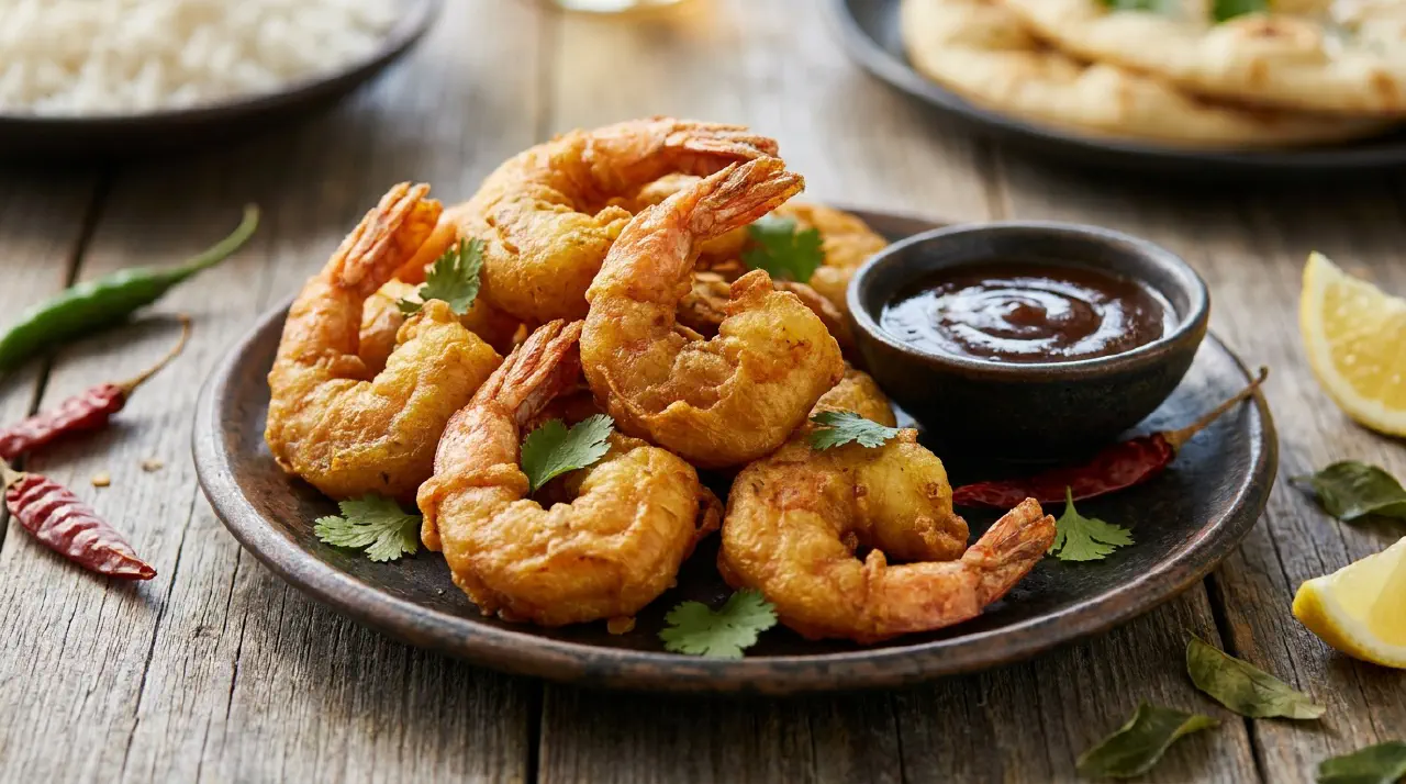 The dish uses cooked prawns, not raw, so the frying is about giving the batter colour rather than cooking the prawns through. It goes quickly — a couple of minutes per batch in hot oil. Serve them while they still crunch.