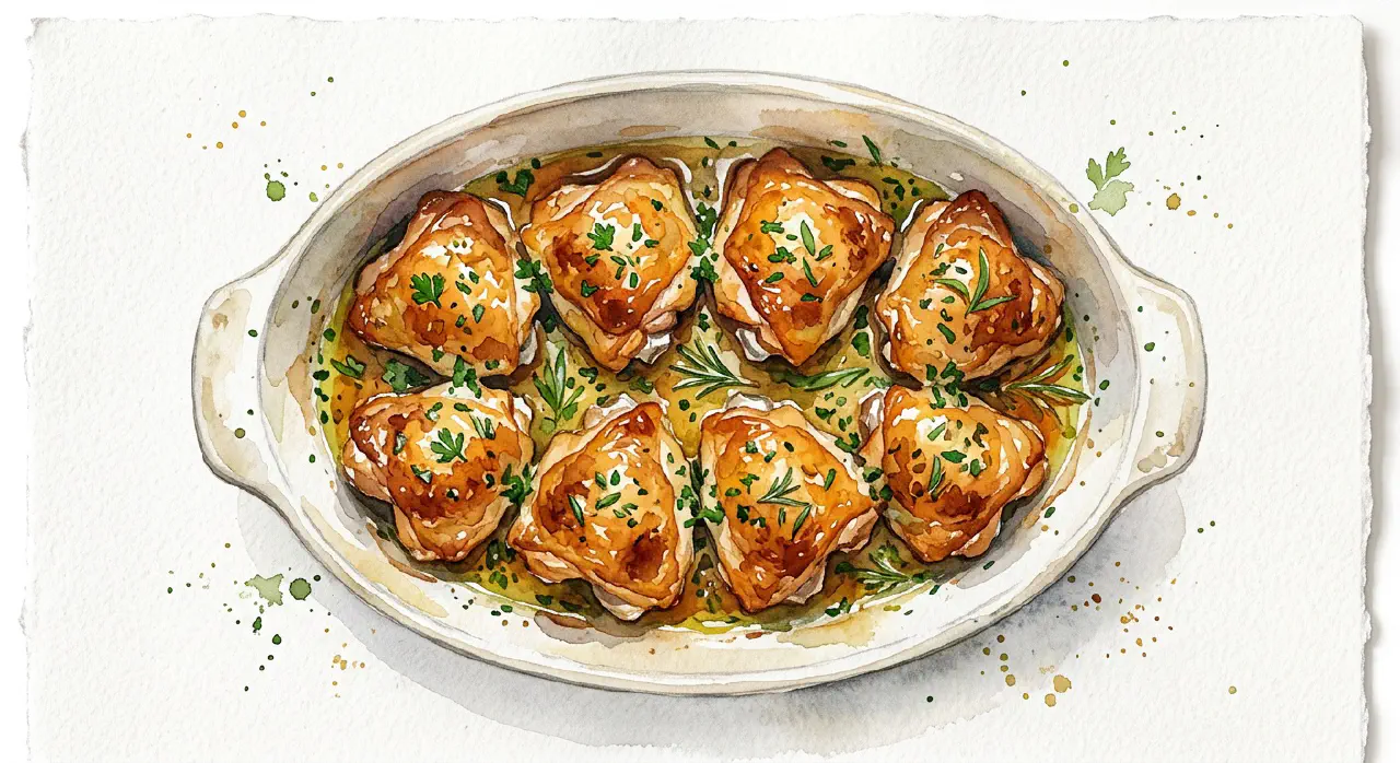 Chicken pieces in a baking dish with a mixture of oil and fresh herbs, first covered with foil until the meat is tender, then finished under the grill until the skin is crispy and golden. It is an easy weeknight dish where the oven does most of the work.