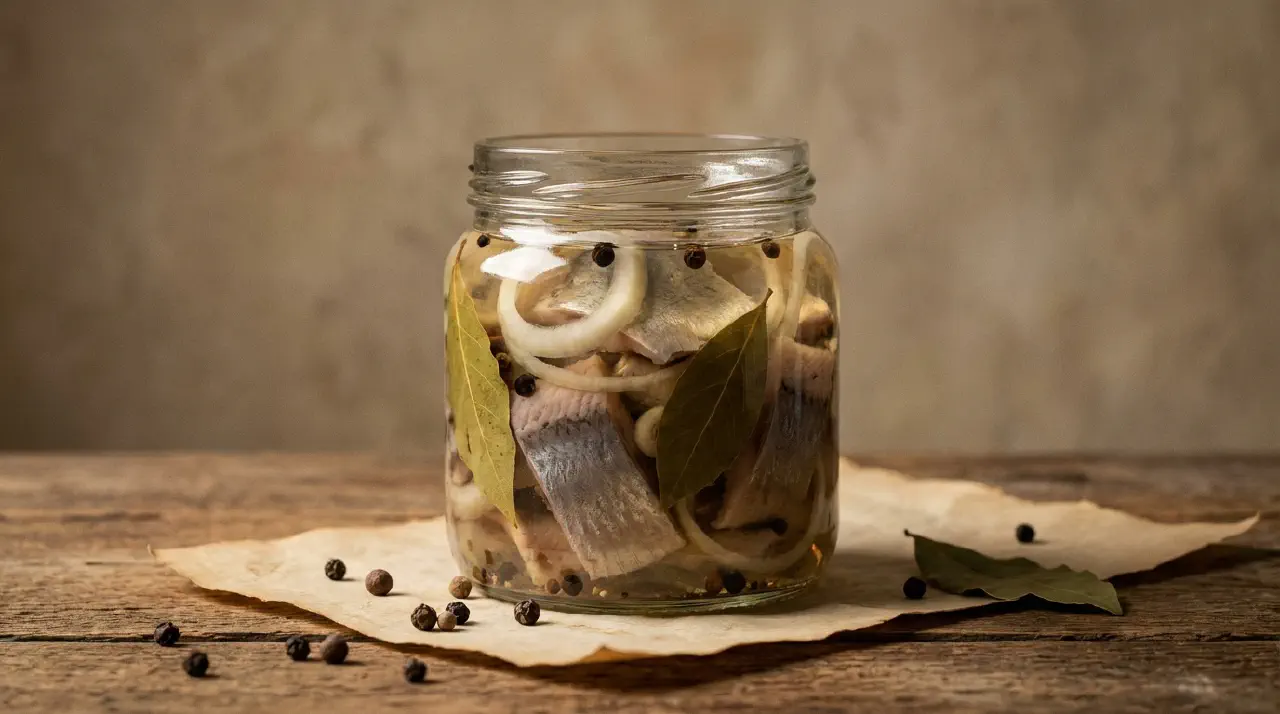 Layer herring pieces, onion rings, and whole spices alternately in a clean glass jar. Pour the cooled brine over the layers. Seal and refrigerate at least 24 hours. Best after 2-3 days. Keeps up to 3 weeks.