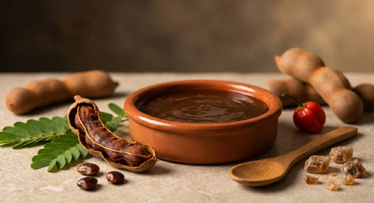 A Trinidadian dipping sauce made from tamarind pulp, chadon beni, garlic, and scotch bonnet. Called “tambran sauce” in Trinidad. The traditional method is no-cook – shell the tamarind, squeeze the pulp with water, and mix in the seasonings. It is the standard accompaniment to doubles, aloo pie, pholourie, and other fried street food.