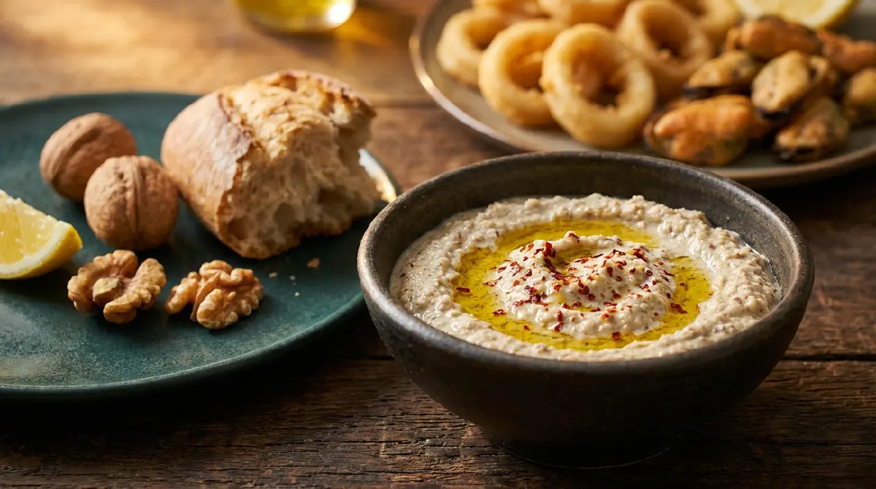 For the yogurt variant (kalamar sosu): reduce walnuts to 30 g, add 120 g strained yogurt, and optionally 1 tbsp mayonnaise.