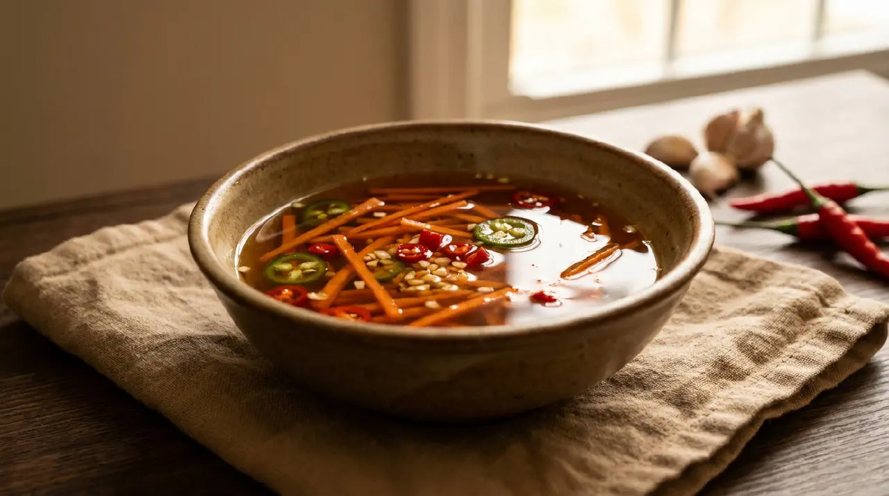 A Vietnamese all-purpose dipping sauce with nuoc mam, vinegar, chilli, garlic, and quick-pickled carrot and peppers. It’s similar to standard nuoc cham but includes pickled vegetables that add texture and crunch. The author calls it “magical” because it complements so many different dishes.