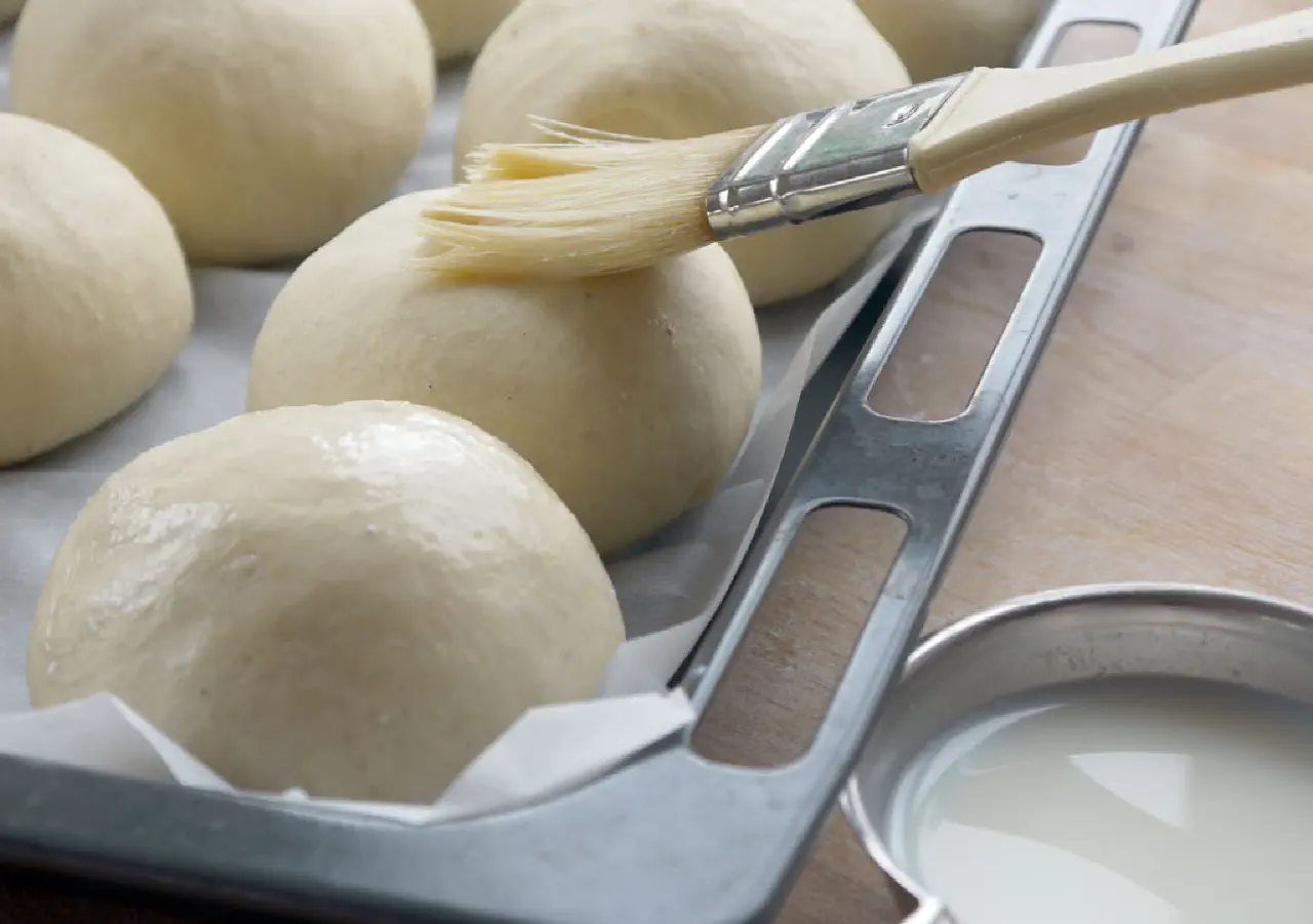 The milk brush serves two purposes: it makes the crust more elastic so the buns can rise more easily, and it helps them brown faster.