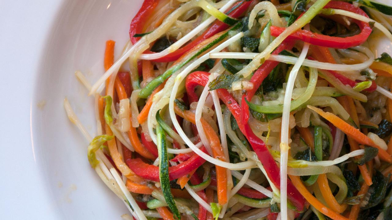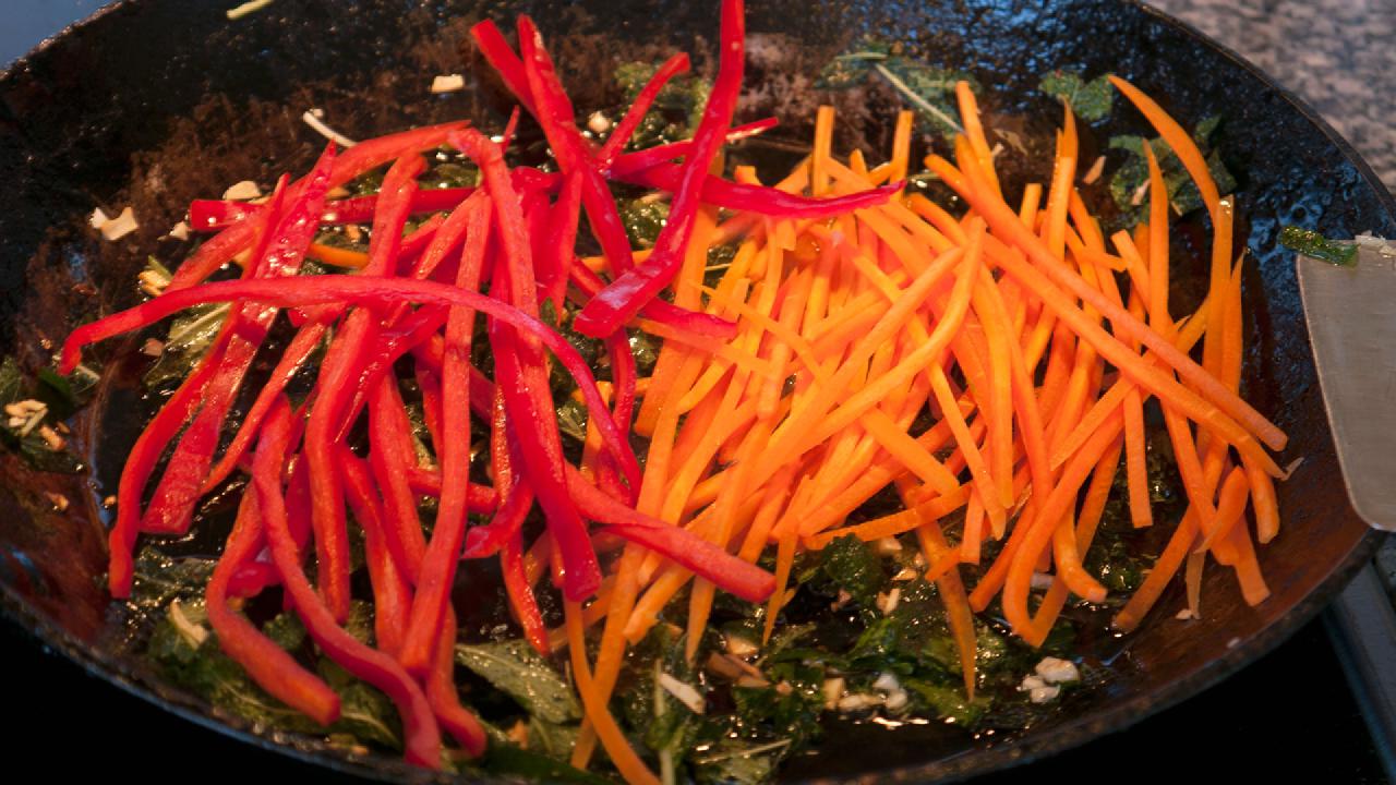 Cut the vegetables into strips very thin strips. It is easiest with a julienne tool. It is more fun the longer they are, but length is not an absolute requirement. If you don’t have a julienne tool I have an article and video about knife handling that might help.
