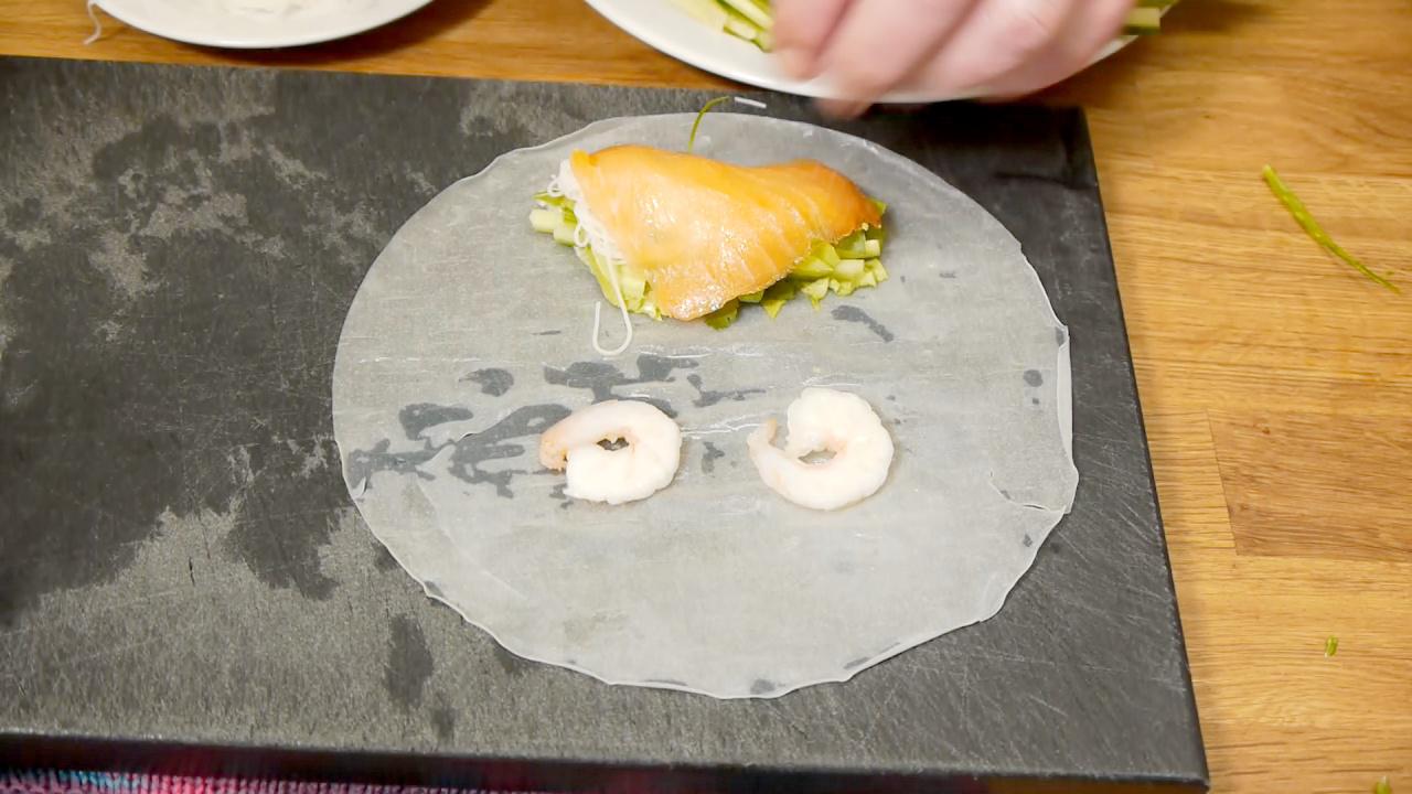 The vegetables must all have the same length to get a nice even roll. The length should preferably be approx. half the diameter of the roll. So with 8½ inch (22 cm) rice paper they should be about 4 iches (10 cm long). I typically cut the cucumber exactly, and then use a piece of that to measure where to cut the other vegetables.