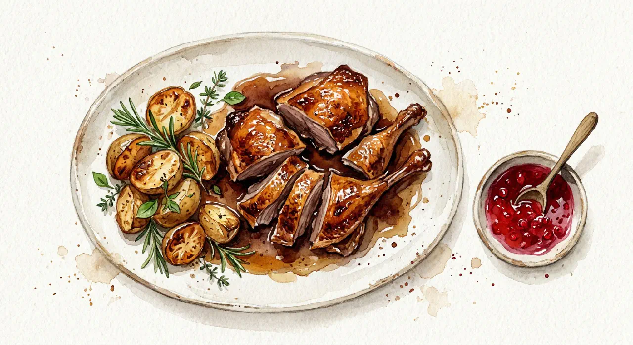 - Halved, pitted green grapes (about 150 g) can replace the jelly — add them while the sauce reduces.