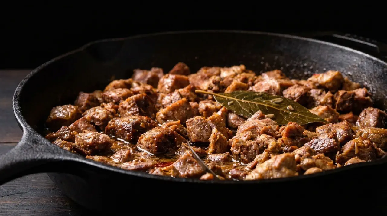 - Return pork to the pan, toss in the sauce. Remove from heat. Discard bay leaves.