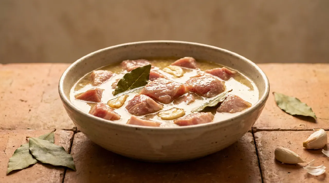 Vinha d’alhos is a Portuguese wine-and-garlic marinade for pork, traditionally from Madeira and the Azores. The name literally means “wine and garlic.” The pork marinates for several days in wine and vinegar with garlic, bay leaves, and spices, then gets pan-fried until deeply browned. This preparation is the direct ancestor of Indian vindaloo.