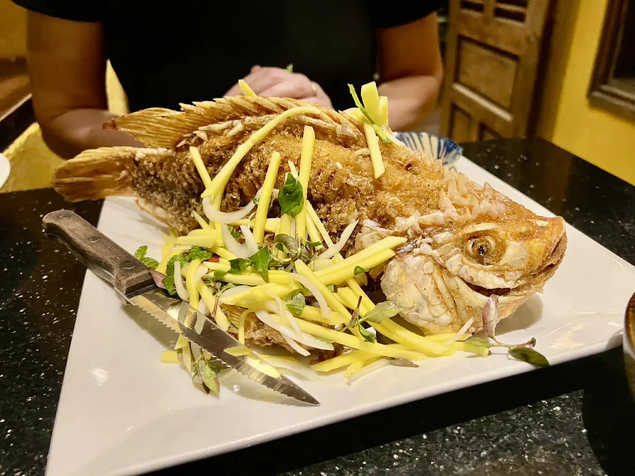 It is a deep fried whole fish which can be a really heavy dish. But the sour sweet mango salad and the magic sauce really lift it up.