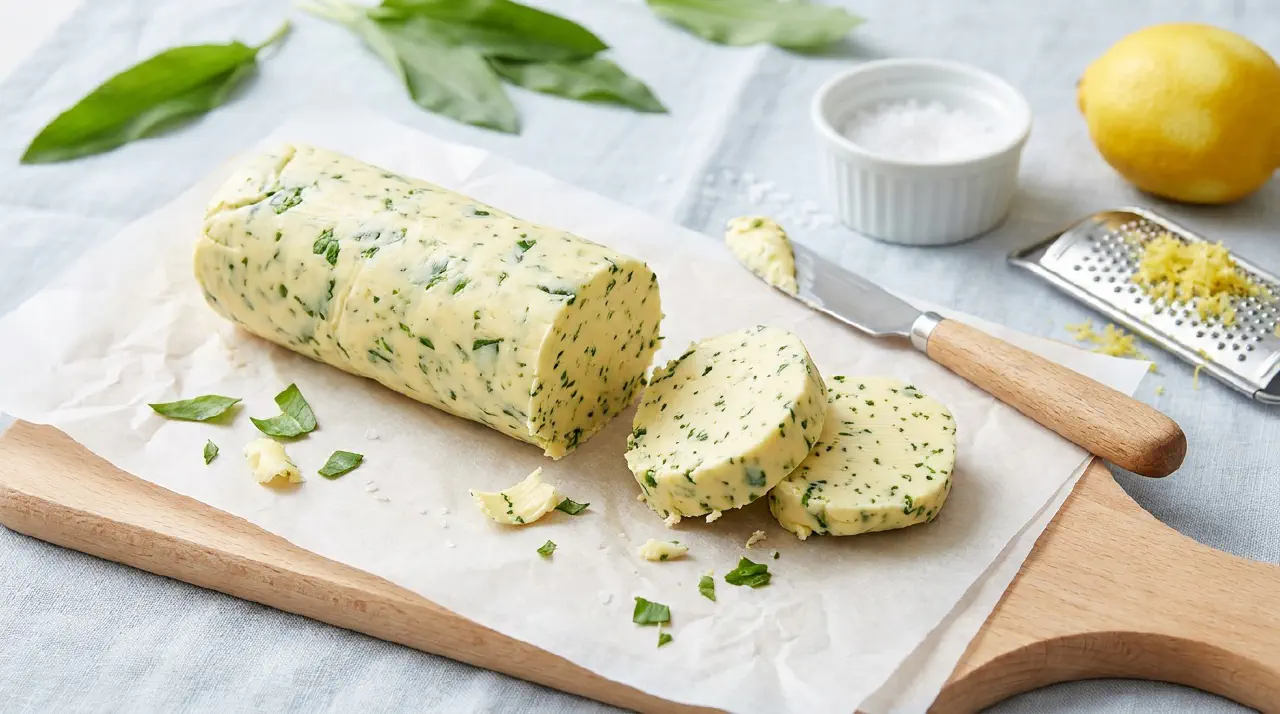 Put the softened butter in a bowl and add the chopped wild garlic, lemon zest, and flaky salt.