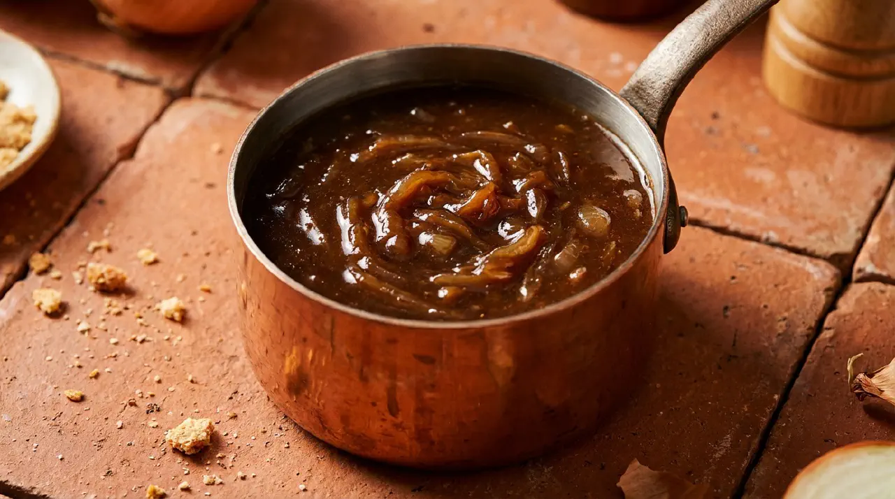 Zwiebelsosse is a German onion sauce – a lot of onions cooked down with red wine, broth, and a touch of tomato paste. It is a simple, savory sauce served over liver, bratwurst, meatloaf (Leberkase), meatballs, and roast meats.
