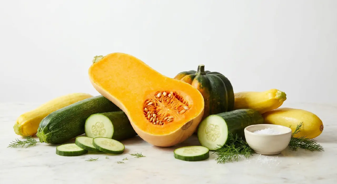 The cucurbit family has made three broad contributions to the kitchen: sweet, moist melons (a fruit story), sweet, starchy winter squashes (harvested fully mature, stored for months), and mild, moist summer squashes and cucumbers (harvested immature, used within weeks). The word “squash” comes from a Narragansett Indian word meaning “a green thing eaten raw.” All cucurbits are native to warm climates and suffer chilling injury at refrigerator temperatures.